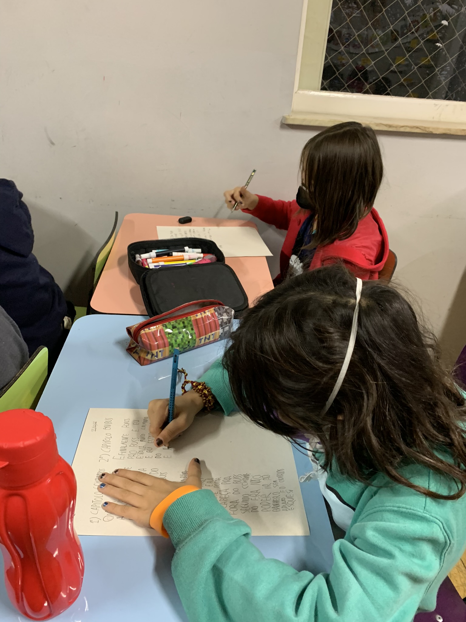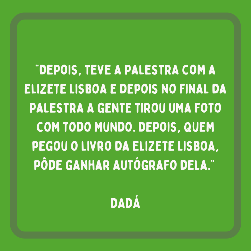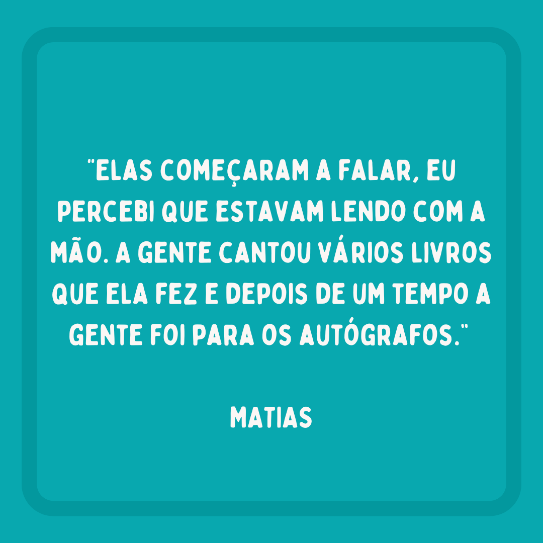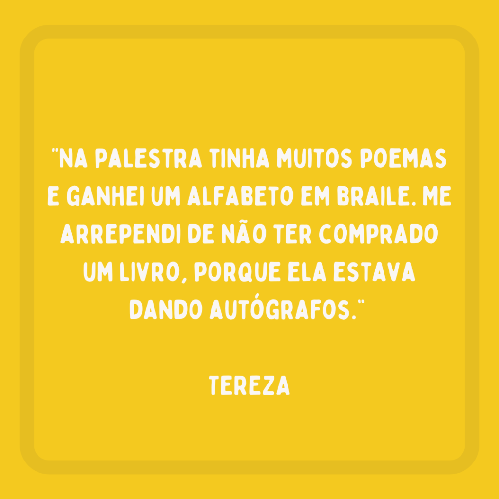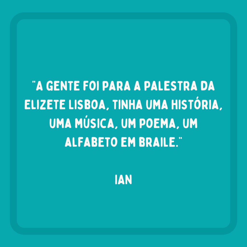 Conhecemos o braile, a libras e a audiodescrição. Folheamos livros e participamos de contações de histórias. Para fechar com chave de ouro, ouvimos a autora Elizete Lisboa, escritora cega, cantar e nos encantar com seu acordeon e suas histórias cheias de poesia! Conhecemos um pouquinho sobre essa tal história de multiverso e realidade aumentada e como tudo isso é importante para as pessoas com deficiência.